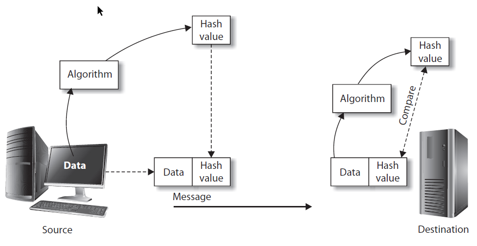 Untuk memastikan data integrity ketika berkomunikasi melalui jaringan, sistem yang mengirim informasi tersebut menjalankan sebuah matematika algoritma yang kita kenal dengan hashing algorithhm yang menghasilkan hash value. Hash value tersebut akan dikirimkan bersama data. Pada tempat yang menerima data dan hash value juga melakukan proses yang sama untuk mendapatkan hash value dari data yang diterima, lalu hash value dibandingkan, jika nilainya sama maka tidak terjadi perubahan data saat proses trasmisi berlangsung.